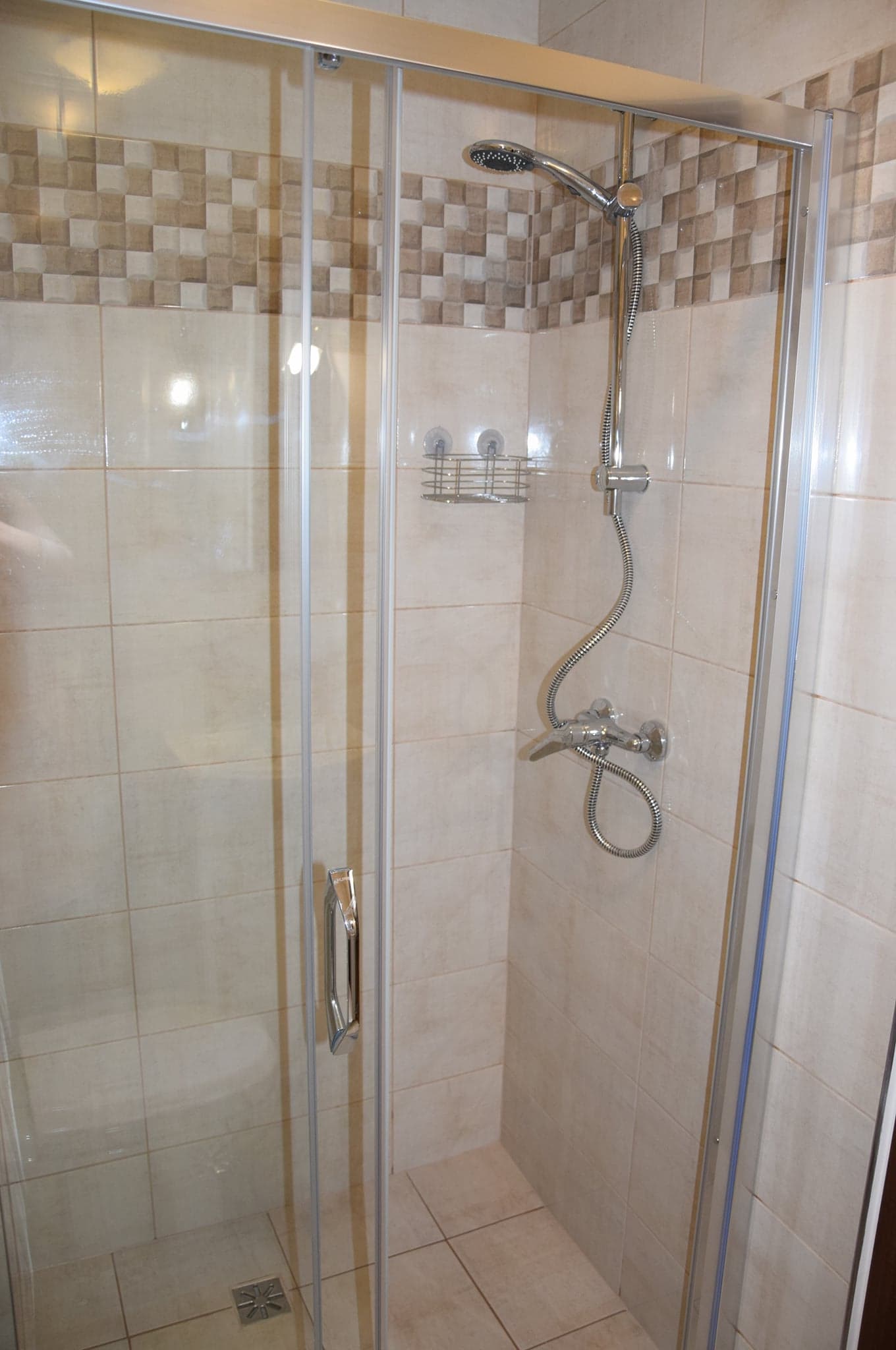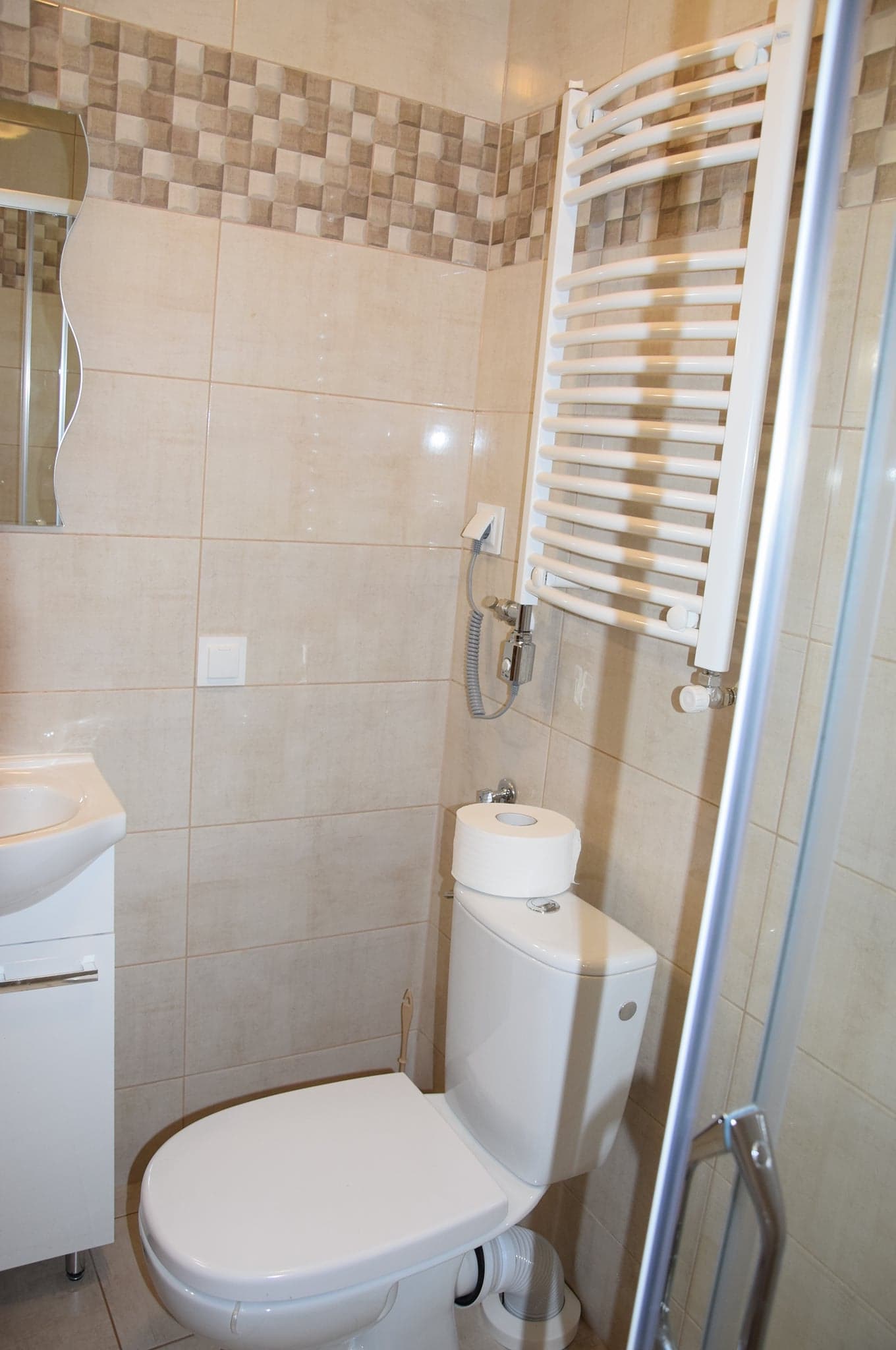 osobowe łóżka, stolik, krzesełka, przestronną szafę i nowoczesną łazienkę z kabiną prysznicową,