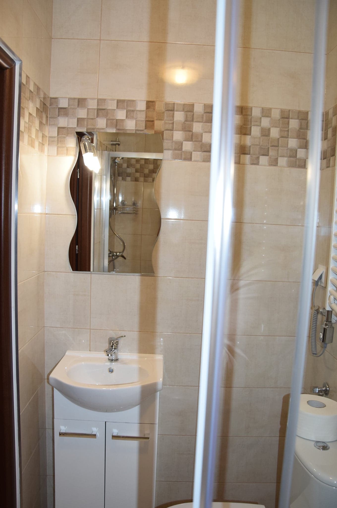 osobowe łóżka, stolik, krzesełka, przestronną szafę i nowoczesną łazienkę z kabiną prysznicową,